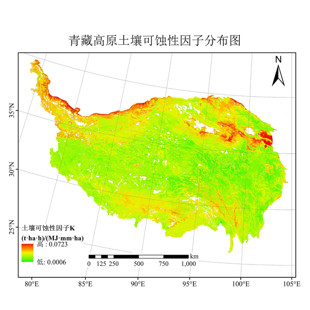 土壤可蚀性因子是反映土壤性质应对侵蚀时的敏感程度,是CSLE、RUSLE等模型计算的基础因子数据,是土壤侵蚀定量评价的基础数据。以青藏高原数字土壤制图产品数据集(2015-2024)(刘峰,张甘霖)为基础,结合水力侵蚀科考调查的土壤样品测试分析数据,采用Wischmeier等的诺谟公式计算K因子值,但如有机质含量较高地区的K值为负,则采用EPIC法计算K值,完成青藏高原土壤可蚀性因子K制图。K因子栅格图的空间分辨率为90m,WGS_1984坐标系和Albers投影(中央经线105°E,标准纬线25°N和47°N)。更新土壤可蚀性因子,提升数据准确度,有助于进一步精确估算青藏高原土壤侵蚀量。